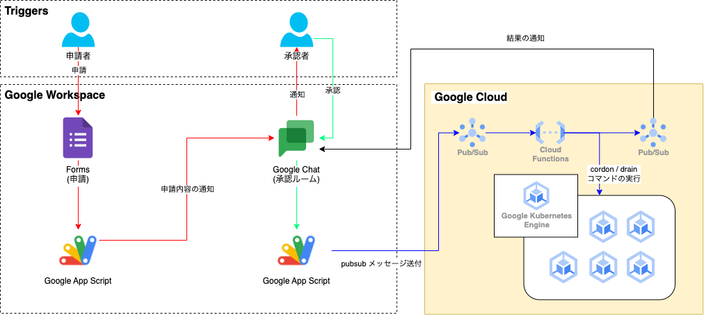 - Cloud Pub/SubからCloud Functionsを呼び出し、対象の操作をGoogle Kubernetes Engineに対して実行する。